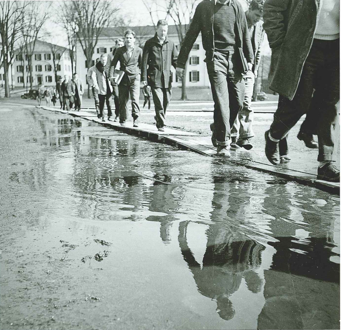 The Chinook-like wind that swooped in yesterday briefly made the Green "mud-luscious and puddle-wonderful," as e e cummings might say. But we are lucky: the Green now drains pretty quickly. It was not always so. For most of Dartmouth's history mud season turned the Green into a sloppy mess. To deal with the problem, every March from the 1880s until the 1950s, the College would lay down "duckboards" along the pathways on the Green. The narrow boardwalks kept students relatively dry and mud free on their way to class, but, if a particularly squirrelly student stomped hard, he could shoot water through the slats and soak anyone nearby. For a time there was even a dance, "The Duckboard Drag," held each March to celebrate the coming of Spring.In the 1950s, the College installed a drainage system and the duckboards were retired, or should I say cremated, for they fueled at least one Dartmouth Night bonfire.